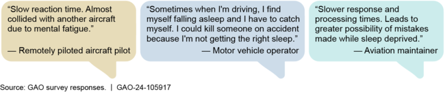 Many service members are not getting the Department of Defense (DOD) recommended 7 or more hours of sleep each day. The department's overarching fatigue-related guidance emphasizes service members obtain at least 7 hours of sleep for optimal performance and readiness. For over a decade, DOD surveys have found that the majority of service members report sleeping 6 or fewer hours per night. Respondents to GAO's nongeneralizable survey cited similar issues. For example, many respondents are sleeping too little, and roughly half of respondents have poor sleep quality regardless of quantity. Survey respondents provided examples of how sleep deprivation has affected their work, from nearly colliding with another aircraft to falling asleep on the job.
