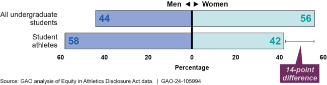 GAO found that more women enroll in college than men, but more men participate in varsity college athletics. The overall athletic participation rate for women was 14 percentage points lower than their enrollment rate in academic year 2021–2022. At about two-thirds of colleges (63 percent), the rate of women's athletic participation was at least 10 percentage-points lower than their enrollment rate. Further, 40 percent of colleges not only had a large difference between women's athletic participation and enrollment rates, but also offered the same number or fewer varsity sports for women in academic year 2021–2022 compared to 2009–2010.