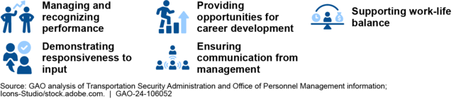 Leadership of the Transportation Security Administration (TSA) has identified the need to improve employee engagement—their sense of purpose in their job—as central to the agency's security mission. According to the Office of Personnel Management, engaged employees are more innovative, productive, and committed in their jobs, and thus less likely to leave. GAO found that five key drivers affect the engagement of TSA's Transportation Security Officers (TSO), who comprise the majority of TSA employees.