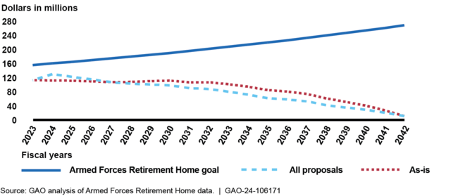 GAO developed projections of AFRH's trust fund balance through fiscal year 2042 under two scenarios: AFRH continuing to operate as-is and AFRH operating with all quantifiable proposals implemented. GAO's analysis shows that whether AFRH continues to operate under its current scenario or implements all proposals, the trust fund will likely continue to decline without other significant efforts to bolster it (see figure). Additionally, AFRH is not projected to meet its goal for the trust fund balance.