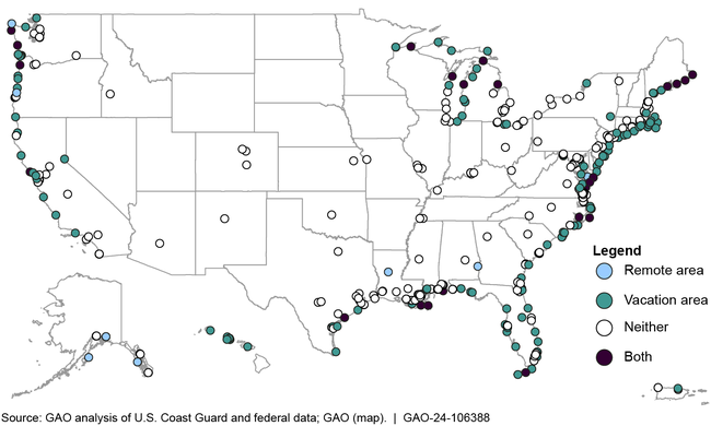 Coast Guard Units Located in Areas that are Either Remote, Contain Majority High Vacation Rentals, or Both, as of 2023