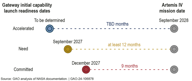 The Gateway program plans to update the analysis it used to inform its cost and schedule commitments at a fall 2024 program-level review. This will help determine the feasibility of the Artemis IV mission date. To reach lunar orbit and ensure all systems work as planned, the PPE and HALO need to launch at least 12 months before the Artemis IV mission, or 3 months earlier than Gateway's current committed date. NASA officials said the program plans to work to an accelerated, to-be-determined date that would provide more schedule flexibility.