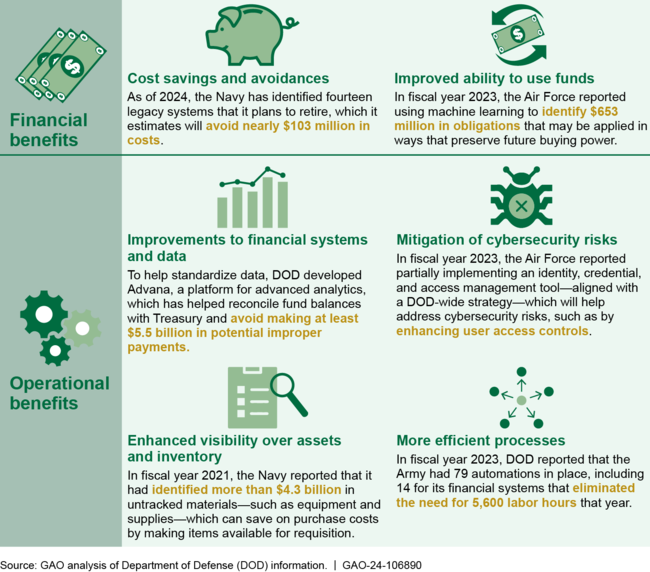 Department of Defense (DOD) financial statement audits have resulted in a range of financial and operational outcomes, and additional outcomes are anticipated. According to DOD information, DOD's audit remediation efforts have resulted in financial benefits, including cost savings and avoidances, and improved ability to use funds. GAO also found that DOD's efforts have resulted in operational benefits, including improvements to financial systems and data, mitigation of cybersecurity risks, enhanced visibility over assets and inventory, and more efficient processes (see figure).