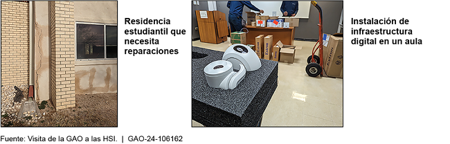 Las Instituciones de Servicio a Hispanos (HSI, por sus siglas en inglés), es decir, universidades con una matrícula de estudiantes universitarios de al menos el 25 por ciento de hispanos, tienen grandes necesidades de instalaciones, según la encuesta generalizable de la GAO sobre las HSI. Según la encuesta de la GAO, se estima que, en promedio, el 43 por ciento del espacio edificable de las HSI (es decir, los pies cuadrados) necesita reparaciones o reemplazo. Los atrasos en mantenimiento diferido, los daños ocasionados por desastres naturales o climáticos severos y los esfuerzos de modernización de las instalaciones impulsan las necesidades de instalaciones de las HSI. Por ejemplo, las HSI tienen un retraso en promedio en mantenimiento diferido de casi $100 millones, según la encuesta de la GAO. Además, se estima que el 77 por ciento de las HSI tienen al menos un proyecto de mantenimiento diferido que aborda una cuestión de salud o seguridad. Más aun, se estima que el 65 por ciento de las HSI han experimentado al menos un desastre natural o un evento climatológico severo en los últimos 5 años que ha dado como resultado la necesidad de reparar o reemplazar algunas instalaciones.
