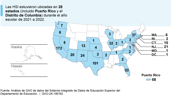 Para realizar este trabajo, la GAO encuestó una muestra representativa de las HSI en los EE. UU. (incluido Puerto Rico) y recibió respuestas generalizables de 169 universidades. Las estimaciones de la encuesta tienen un margen de error no mayor que más o menos 8 puntos porcentuales con un nivel de confianza del 95 por ciento. La GAO también analizó los datos más recientes de las HSI sobre características institucionales y de los estudiantes universitarios (2021 a 2022), finanzas (2020 a 2021), programas de subvenciones para las HSI (2017 a 2022) y fondos de ayuda de COVID-19 (2021). La GAO también visitó 10 HSI que fueron seleccionadas para representar diferentes tamaños, sectores (público o privado sin fines de lucro) y regiones geográficas, y entrevistó a funcionarios del Departamento de Educación y organizaciones de las HSI. Además, la GAO revisó las leyes, los reglamentos, y los directrices federales relevantes.