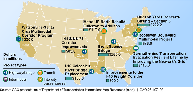 DOT awarded $1.12 billion in FY22 for such projects. Specifically, highway-bridge projects received 7 of 9 awards. The others funded transit and intercity rail projects. But as with some other DOT programs we've reviewed, DOT didn't fully document its rationale for choosing certain projects.