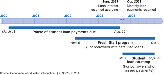 In March 2020, in response to the COVID-19 pandemic, Education implemented a payment pause for borrowers. This pause suspended all federal student loan payments due, stopped interest from accruing, and halted involuntary collections on loans in default. After several extensions, the payment pause ended on August 30, 2023, as required under the Fiscal Responsibility Act of 2023. Interest began accruing on these loans in September 2023, and borrowers’ monthly payments resumed in October 2023, according to Education.