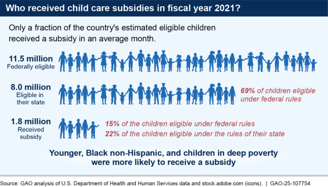 In fiscal year 2021, federal and state government expenditures for child care subsidies totaled about $14.2 billion, according to HHS. Under CCDF, states have substantial flexibility to establish their own eligibility criteria that determine which low-income working families will be served. As a result, children eligible for subsidies under federal criteria may not be eligible under their state’s criteria.