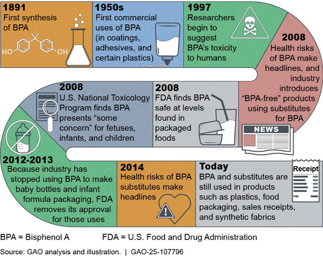 For example, bisphenol A (BPA)—used in plastics and other products—raised safety concerns when laboratory testing indicated potential harmful effects related to reproductive systems, obesity, and cancer. Despite decades of study, there is still no consensus about whether BPA exposure is safe at the levels at which people are exposed, and it continues to be used in some products. While some companies have replaced BPA, there are increasing concerns about the health risks of substitutes that are chemically similar to BPA. Thus, consumers may not fully understand safety risks when buying some products labeled "BPA-free."