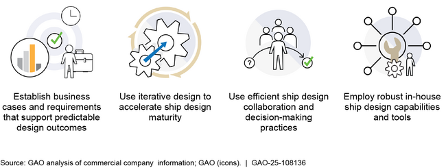 GAO has previously identified leading ship design practices used by commercial ship buyers and builders that the Navy can use to achieve more timely, predictable outcomes for its shipbuilding programs.