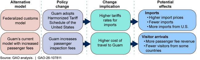 We looked at alternatives to Guam’s current customs model, including those used in other U.S. territories. Adopting one of these options could require changes in laws, funding sources, and technology, among other things.