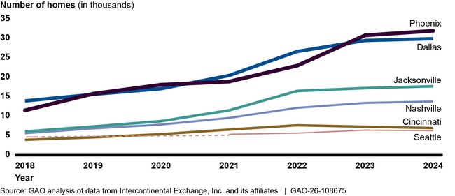 GAO found the following trends in institutional investor homeownership from 2018 through 2024 in six metropolitan statistical areas—Cincinnati, Dallas, Jacksonville, Nashville, Phoenix, and Seattle: